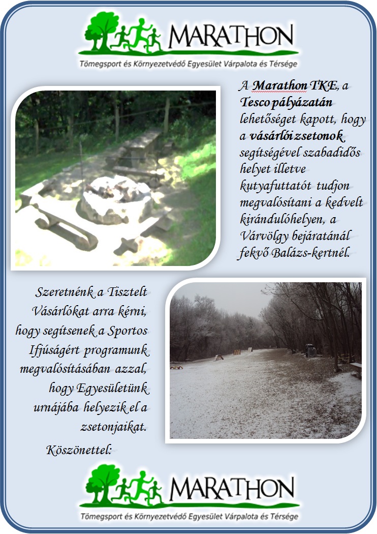A Marathon TKE, a Tesco pályázatán lehetőséget kapott, hogy a vásárlói zsetonok segítségével táborozást illetve sportversenyeket tudjon megvalósítani. Szeretnénk a Tisztelt Vásárlókat arra kérni, hogy segítsenek a Sportos Ifjúságért programunk megvalósításában azzal, hogy Egyesületünk urnájába helyezik el a zsetonjaikat.